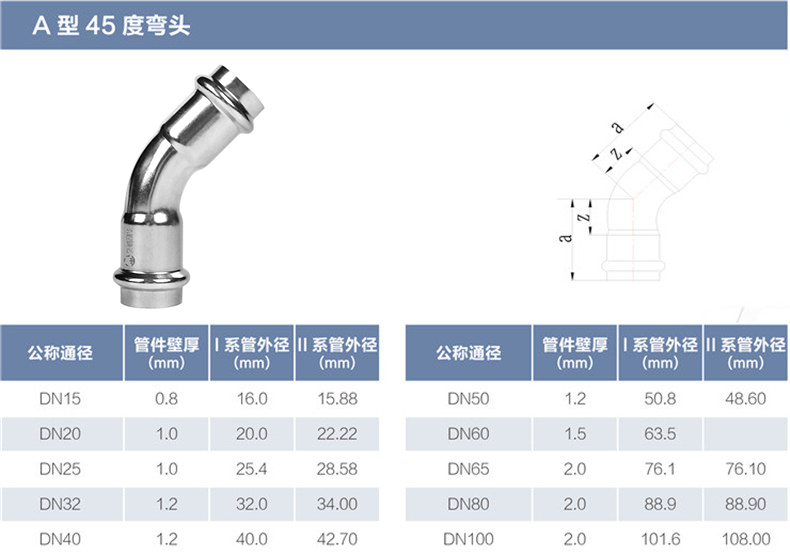 A型45度彎頭丨材質(zhì)(Grade): 304/304L、316L 丨原料來源(Source of raw materials): 全部符合相關(guān)國家標(biāo)準(zhǔn)要求,用料來源酒鋼、太鋼、張浦、東特等 丨焊接方式(Welding method): 氬弧焊或等離子焊(TIG OR PLASMA在線)+氬弧焊(TIG離線) 丨執(zhí)行標(biāo)準(zhǔn)(Executive standard): GB/T 19228.2-2011 GB/T12771 丨參數(shù)對照表(Parameters):
