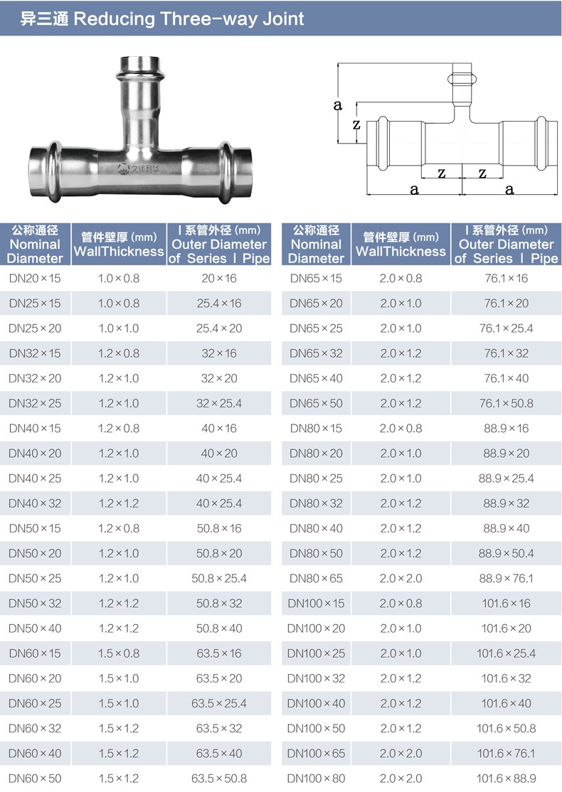 異接三通丨材質(zhì)(Grade): 304/304L、316L 丨原料來源(Source of raw materials): 全部符合相關(guān)國家標準要求,用料來源酒鋼、太鋼、張浦、東特等 丨焊接方式(Welding method): 氬弧焊或等離子焊(TIG OR PLASMA在線)+氬弧焊(TIG離線) 丨執(zhí)行標準(Executive standard): GB/T 19228.2-2011 GB/T12771 丨參數(shù)對照表(Parameters):